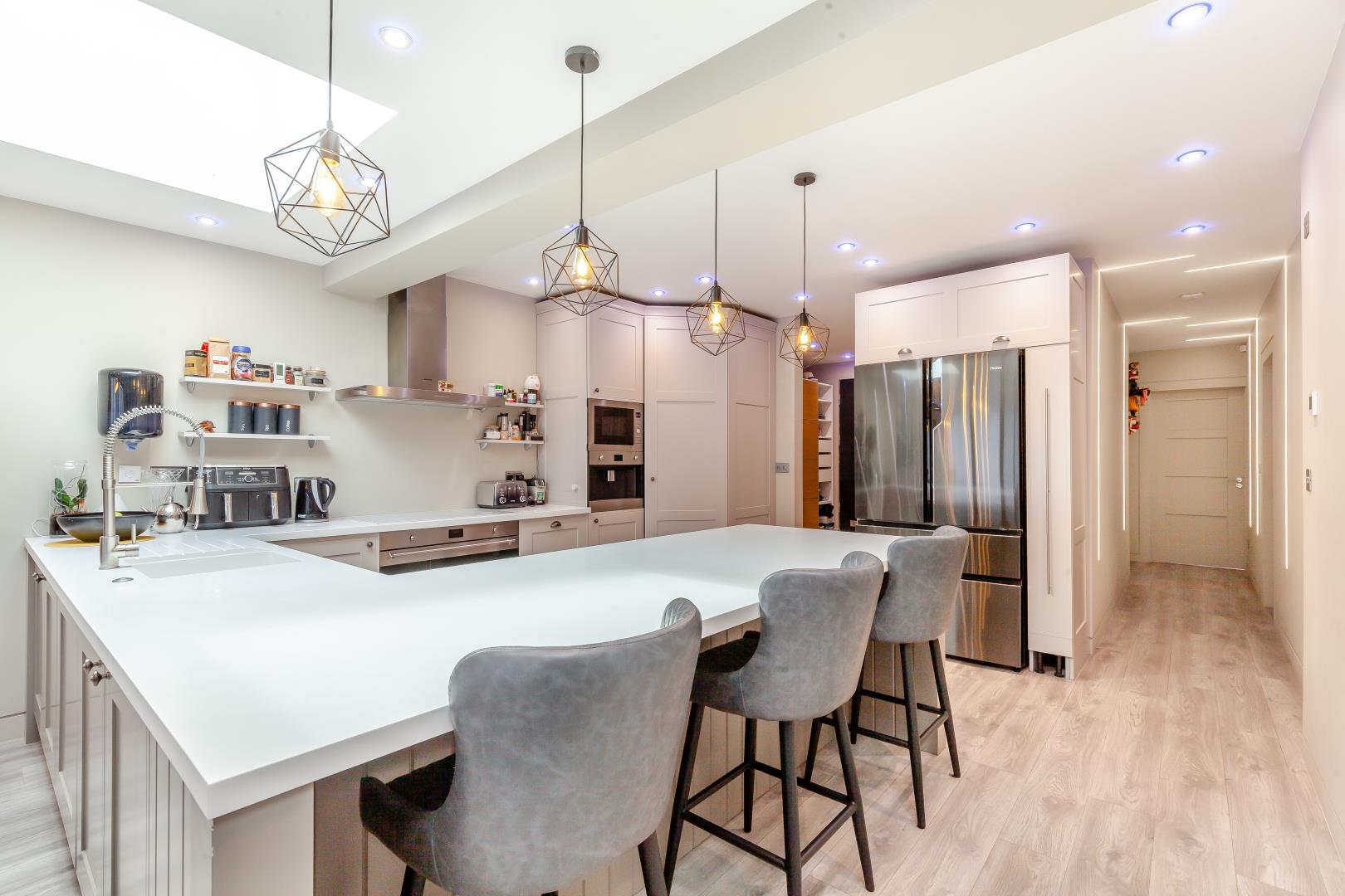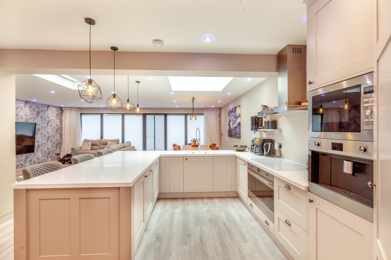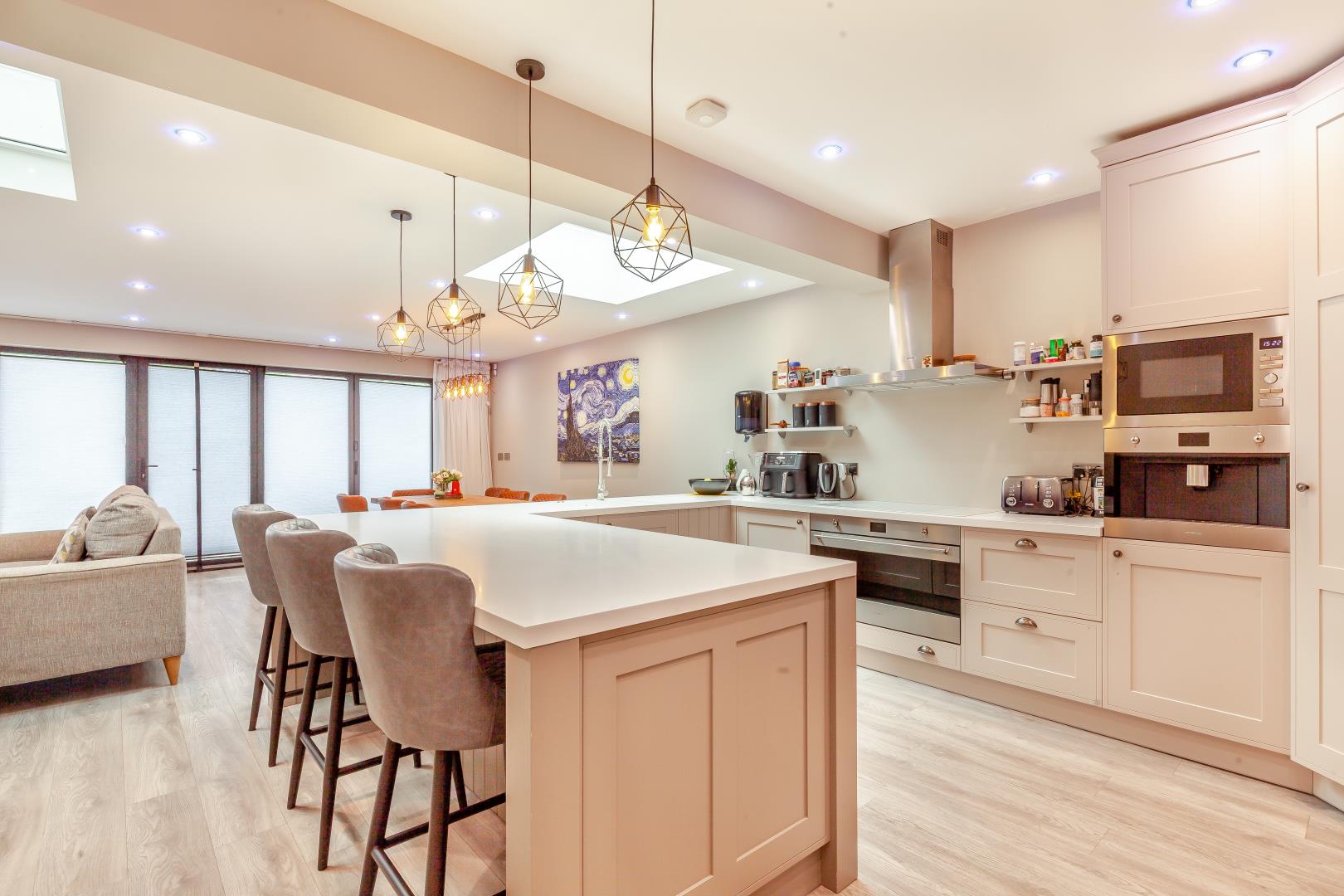 Fitted with a matching range of base & eye level units. Including matching breakfast bar. Including matching island unit. Appliances - Miele. Counter tops - Ceramic. Counter tops - Solid surface material. Extractor hood Overhead. Pantry. Underfloor heating. Cupboard. Vinyl flooring. Spot lights. Recessed spot lights. Low voltage lighting. TV aerial point.
