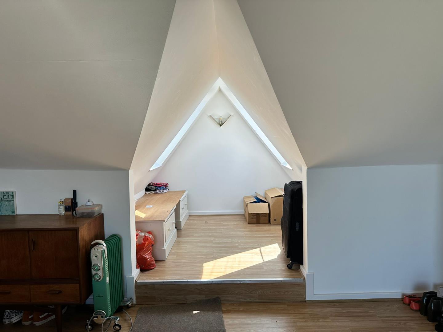 The bedroom in the loft has a wooden flooring and a pitched room providing great space for storage. This bedroom has a balcony/ terrace with views onto the rear and great for a miracle morning wake up routine. A great place to have a coffee and read.