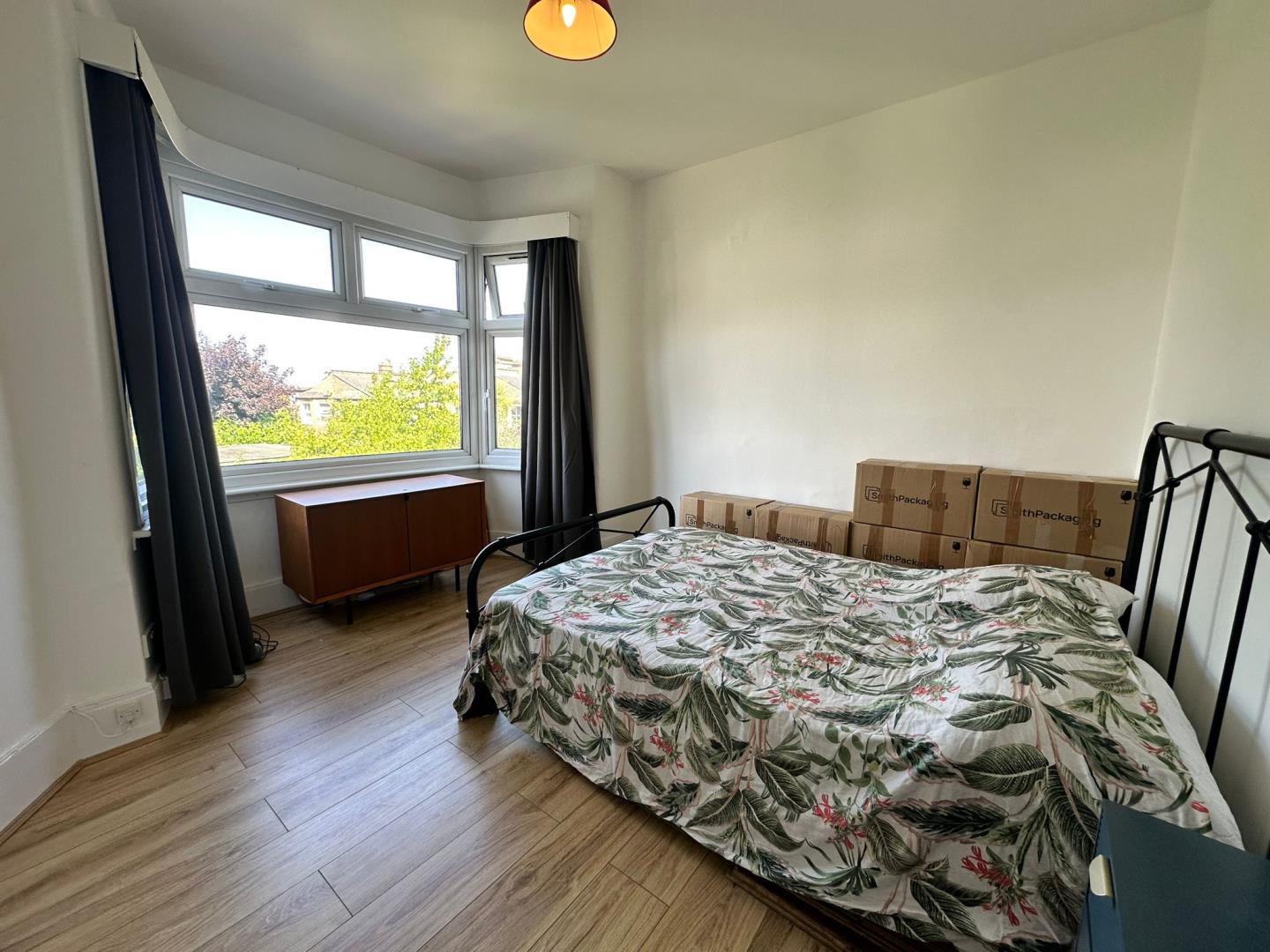 To the front side of the house are two bedrooms. The smaller of the two bedrooms has wooden flooring and a window to the right looking onto Talbot Road