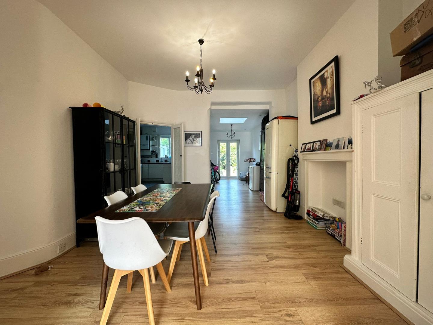 The dining place has the continuation of flooring with storage cupboard to the right and ahead to the rear of dining room is access to the garden.