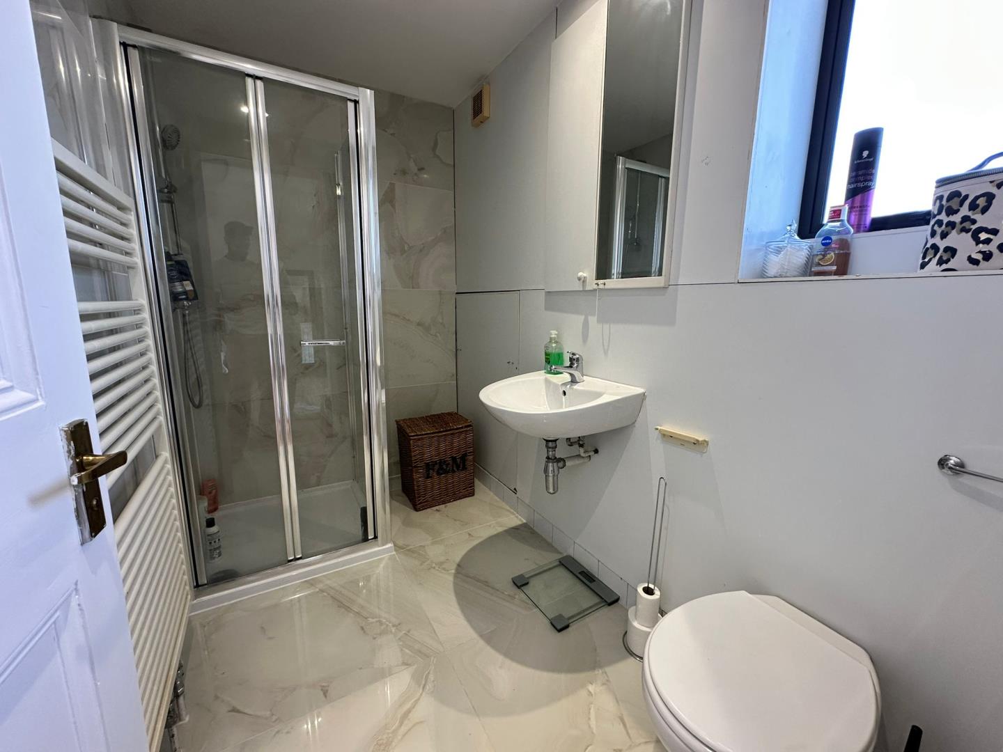 To the left of this bedroom is the en-suite. The en-suite has a modern finish with large marble floor tiles, a towel radiator and shower enclosure with power shower. Having storage above the sink and a window too.